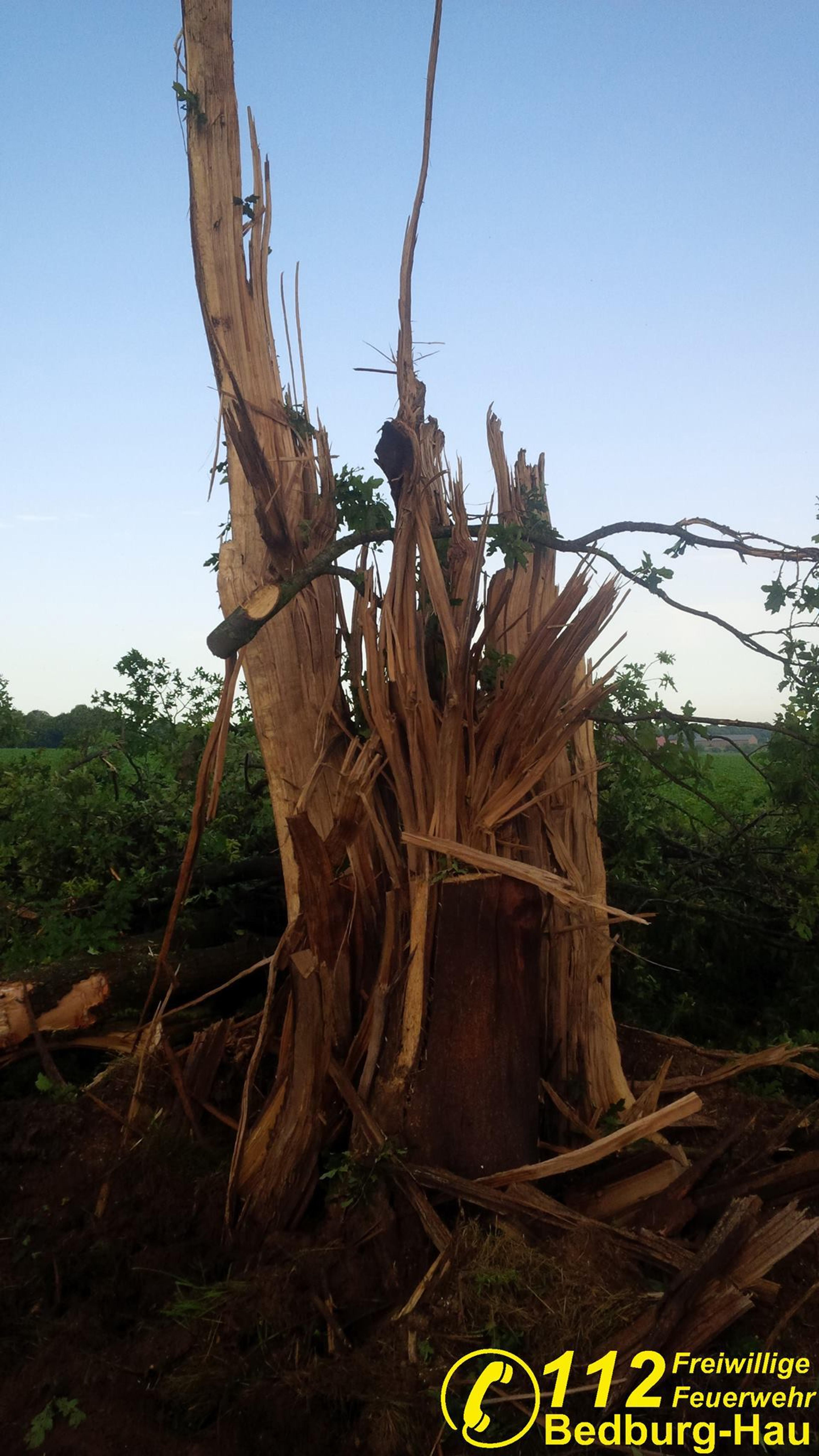 Aufgrund des Unwetters der gestrigen Abends kam es gegen 22:30 Uhr zu einem Einsatz der Freiwilligen Feuerwehr Bedburg-Hau. Auf der Pfalzdorfer Straße in Louisendorf schlug ein Blitz in eine riesige Eiche ein. Durch den Einschlag wurde Baumstamm vollkommen zerfetzt und der gesamte Baum auseinander gerissen. Bruchstücke sowie Astwerk folgen mehrere Meter weit in umliegende Felder. Baumteile und zahlreiche Bruchstücke blockierten die Straße. Die alarmierten Löschgruppen aus Louisendorf und Schneppenbaum sicherten zunächst die Einsatzstelle. Mit Motorsägen wurden Baumteile zerteilt und geräumt, um die Straße wieder passierbar zu machen. Verletzt wurde niemand.