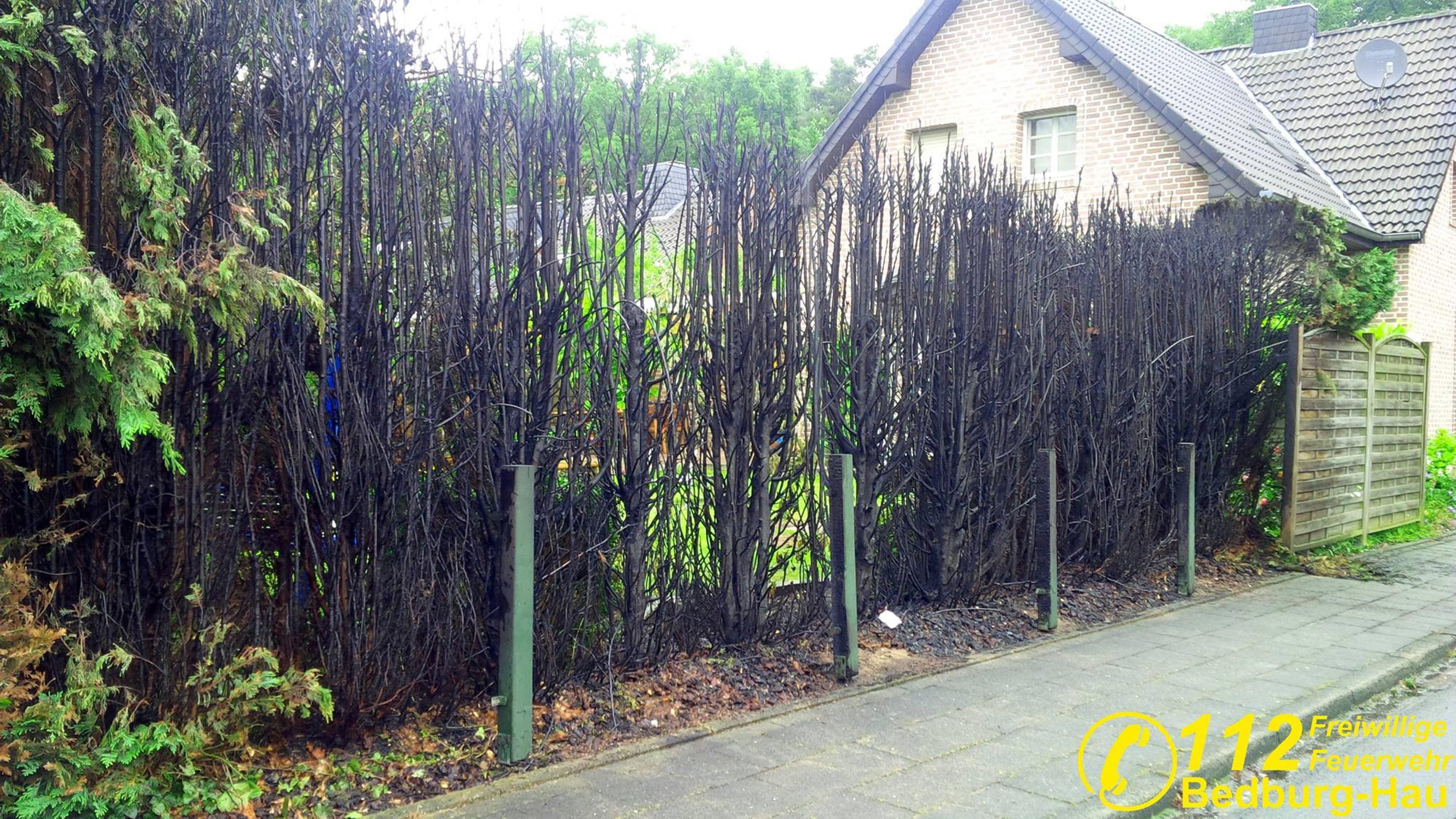 Schrecksekunden für die Eigentümer. Innerhalb weniger Minuten standen knapp 10 Meter Hecke und Zaunelemente in Flammen. Die alarmierte Löschgruppe Schneppenbaum der Freiwilligen Feuerwehr Bedburg-Hau hatte den Brand schnell unter Kontrolle. Eine Ausdehnung konnte verhindert werden. Im Einsatz waren sieben Feuerwehrmänner der Leitung der Gemeindebrandinspektoren Stefan Veldmeijer und Klaus Elsmann.