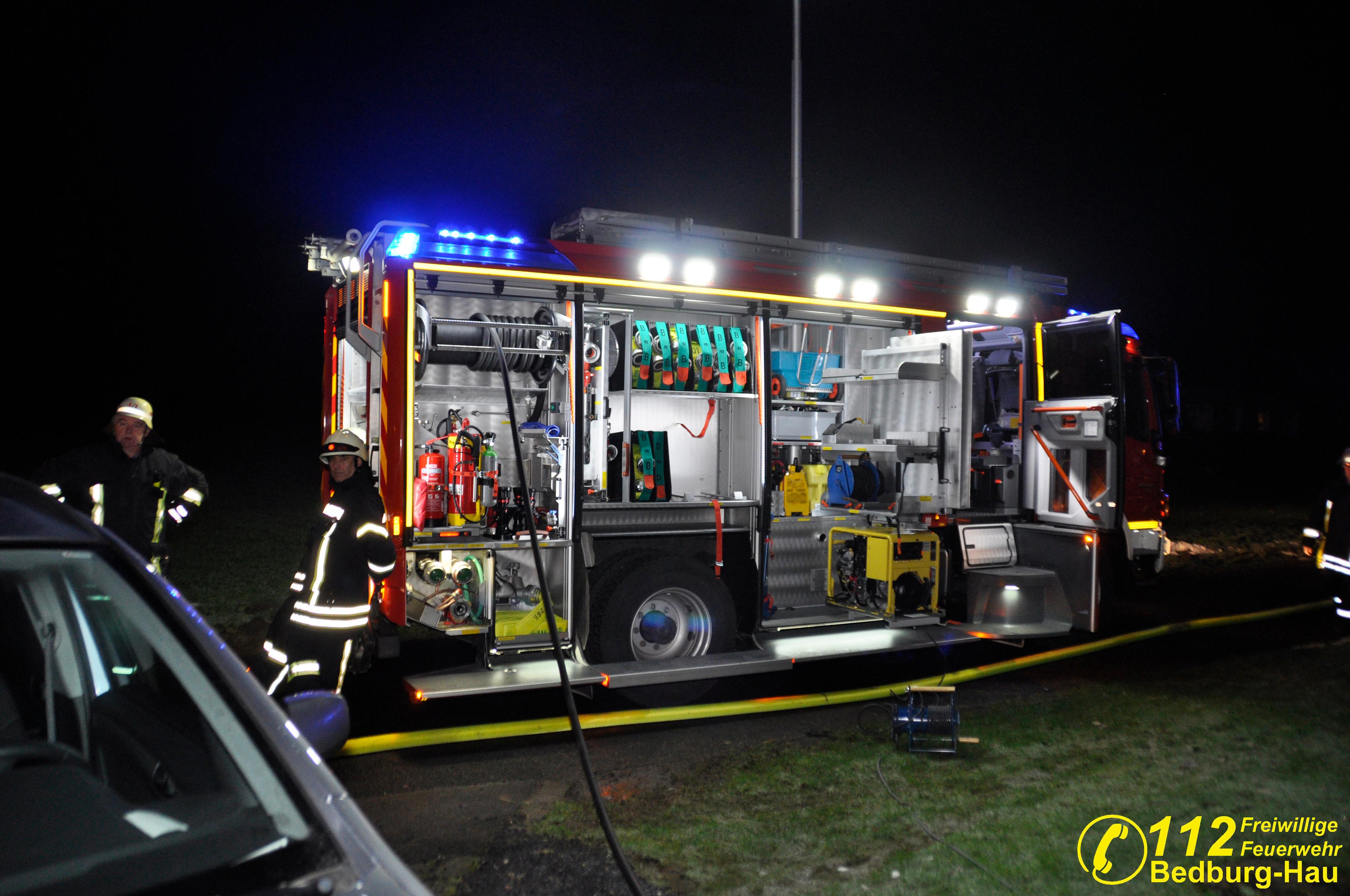Alarmiert wurden um 22:29 Uhr die Löschgruppen Hau und Qualburg der Freiwilligen Feuerwehr Bedburg-Hau. Der Angriffstrupp übernahm die Brandbekämpfung unter schwerem Atemschutz mit einem C-Angriffsrohr. Das Feuer konnte schnell gelöscht werden. Es blieb auf den Entstehungsraum begrenzt. Um eine Brandausdehnung zu verhindern, setzte der Einsatzleiter eine Wärmebildkamera ein. Dadurch wurden kurze Nachlösch- und Räumarbeiten notwendig. Ein Hochleistungslüfter kam zum Einsatz. Bei dem Feuer verendeten 10 Hühner. Sie konnten nicht mehr gerettet werden.