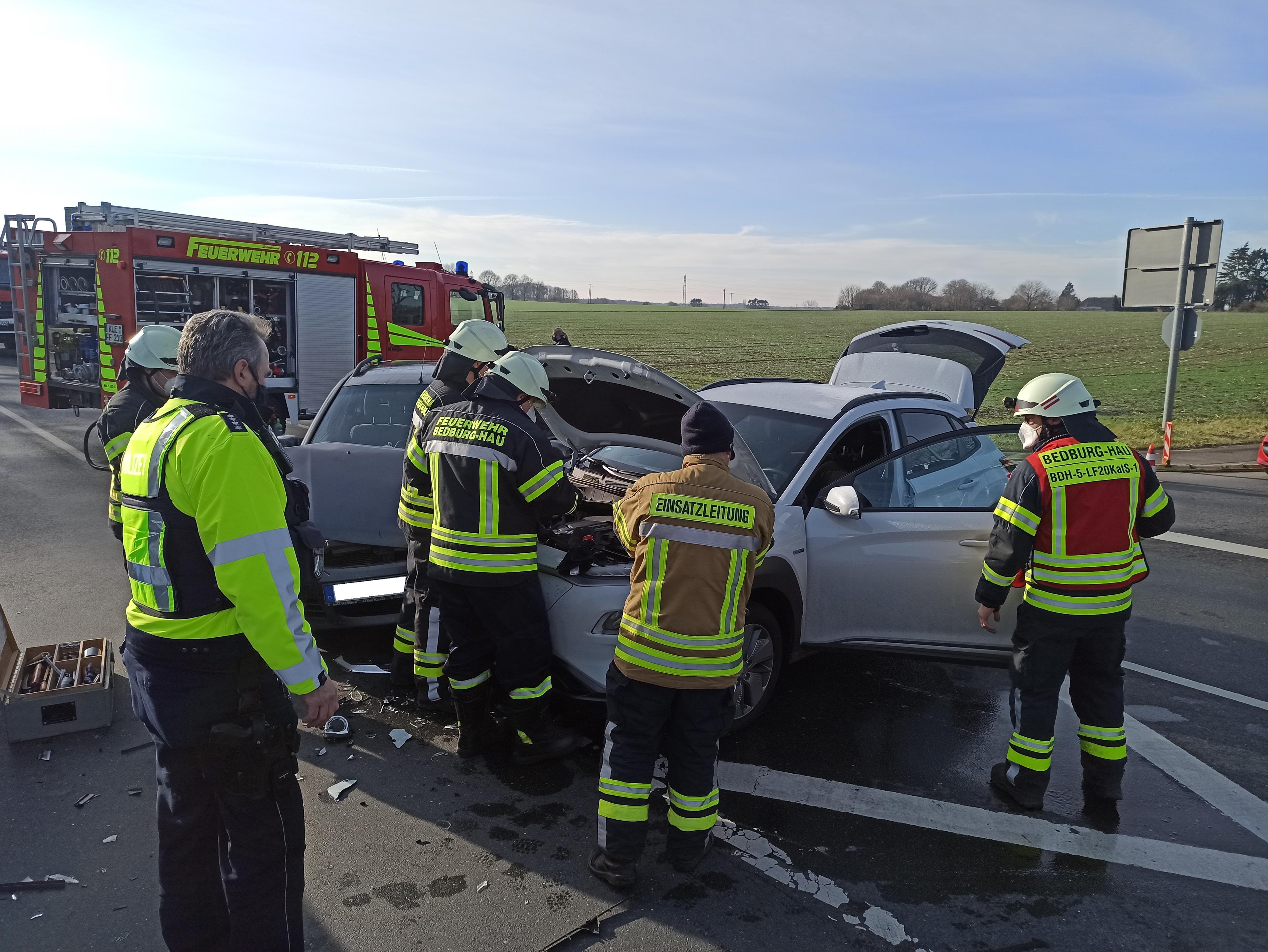 Zu einem Verkehrsunfall mit einer verletzten Fahrerin kam es heute (31.01.2021) gegen 11:40 Uhr im Kreuzungsbereich Uedemer Straße/ Johann-van-Aken-Ring in Schneppenbaum. Die Fahrerin eines Mitsubishi befuhr die Uedemer Straße in Fahrtrichtung Kleve. Dabei stieß sie auf Höhe der Kreuzung mit einem Huyndai Elektrofahrzeug zusammen. Der Fahrer des SUV hatte die Kreuzung über den Johann-van-Aken-Ring aus Fahrtrichtung Hau überqueren wollen. Bei dem Zusammenstoß wurde die Fahrerin des Mitsubishi verletzt. Ihre Beifahrerin und der Fahrer des SUV blieben unverletzt.
